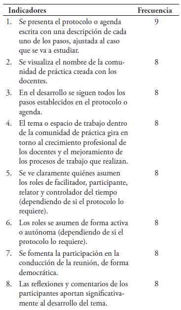 Durante el desarrollo de la asignatura se realizó una observación a cada uno de las 10 gestoras de Jornada Escolar Extendida para determinar en qué medida ponían en práctica los criterios de actuación discutidos en el marco de la asignatura Análisis y Gestión Curricular II para la conducción de una reunión de la CPE. A continuación se presenta una tabla con los criterios contenidos en una pauta de observación del desempeño de las gestoras durante la reunión y la frecuencia con que cada criterio fue observado en el conjunto de observaciones realizadas.