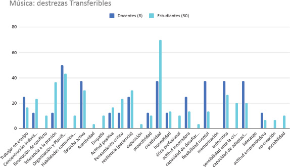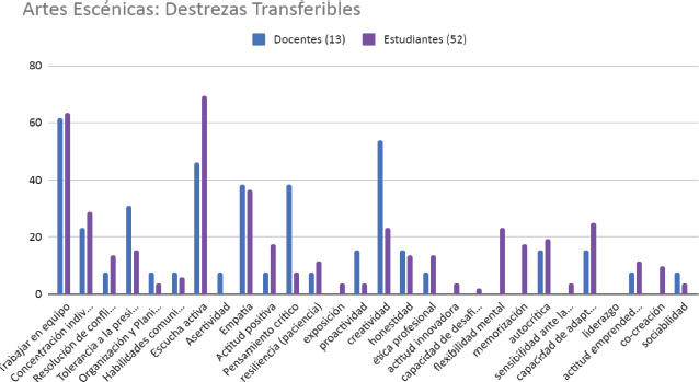 Por otro lado, resulta interesante analizar las diferencias entre las cinco disciplinas artísticas. Por un lado, se ve que los y las estudiantes de música y fotografía, valoran destrezas como la Tolerancia a la presión y la Resolución de conflictos. Mientras que el alumnado de artes escénicas, por ejemplo, puntúa mejor las Habilidades sociales y el Trabajo en equipo. Esto lleva a pensar (Martínez y González, 2019) que es posible establecer una relación entre lo específico de una rama artística y las destrezas que se valoran en relación al perfil del alumno/a que escoge esa rama. O si, por el contrario, las destrezas determinan los valores de la disciplina. Como consecuencia surge la pregunta sobre cuál debe ser el rol de los/as docentes en la transmisión y desarrollo de estas destrezas, es decir, si debe el docente centrarse en aquellas que parece requerir la disciplina o, por el contrario, debe apoyar al estudiante para que adquiera otras habilidades. En este sentido, García y Cárdenas (2018) pone en tela de juicio el éxito de ciertos espacios formativos que no contemplan la transición que han de hacer los y las estudiantes desde el ámbito de estudio al entorno laboral concreto. Esto provocaría una frustración que iría directamente en desmedro de las capacidades de las personas graduadas para poder insertarse en el ámbito laboral.
