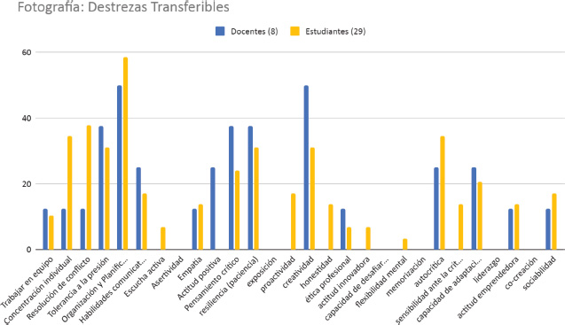 Por otro lado, el claustro de fotografía (8) destacó Organización y planificación como destreza fundamental con un 50%. En segundo lugar, obtienen la misma puntuación Pensamiento crítico, Tolerancia a la presión y Resiliencia (37.5%). No obstante, los/as docentes no señalaron como relevantes para dicho campo Sensibilidad ante la crítica, Proactividad, Memorización, Liderazgo, Honestidad, Flexibilidad mental, Exposición, Escucha activa, o Asertividad, entre otras.