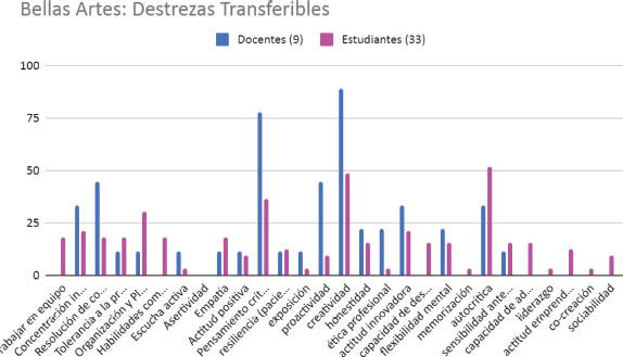 En este, sentido se considera como referencia un estudio similar (SV Flys, Torres y Odogherty, 2021) en donde se toma como eje la empleabilidad para generar un acercamiento de posturas frente a estas destrezas entre alumnado y claustro. La presente investigación coincide con el mencionado estudio en cuanto a algunos aspectos centrales. En primer lugar, tampoco se manifiesta concordancia entre las valoraciones de las destrezas transferibles de un colectivo y otro. Y, en segundo lugar, no hubo coincidencia entre las personas pertenecientes a los grados de las diferentes disciplinas artísticas, ya sean estudiantes o docentes.