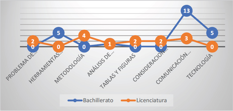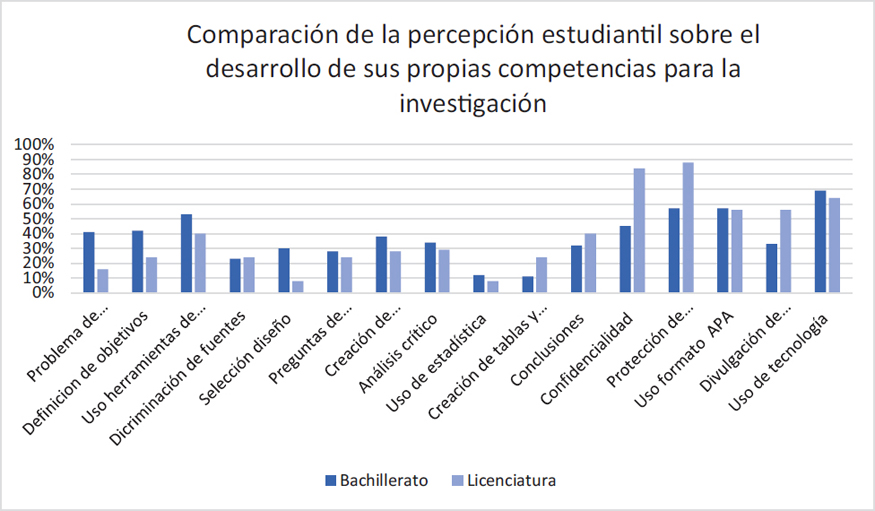 Como se observa en la tabla 2, en bachillerato universitario la dimensión predominante es la habilidad para comunicarse con un 54%, seguida por el uso adecuado de herramientas de búsqueda y el uso de tecnología, ambas con un 20.8%. Las demás dimensiones están en su mayoría ausentes. En el programa de licenciatura, las competencias de investigación son más visibles, especialmente los aspectos metodológicos y consideraciones éticas, pero muchas otras también están ausentes. La figura 1 muestra la comparación entre ambos niveles.
