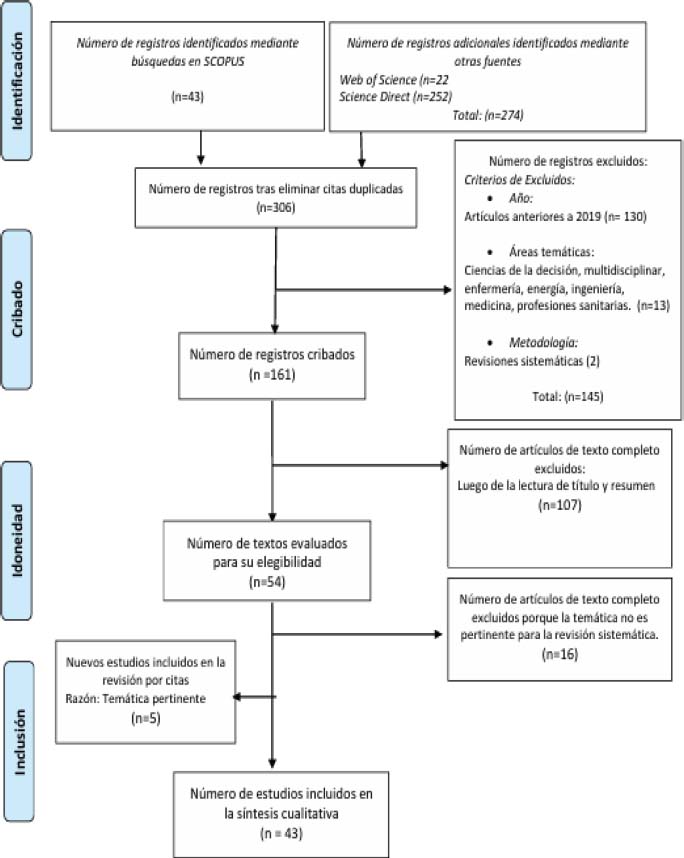 La búsqueda de los artículos inicia con la selección de las contribuciones académicas a través de la ecuación de búsqueda en las bases de datos de Scopus, ScienceDirect y Web of Science (WoS), de este ejercicio se identificaron N=317 artículos potencialmente relevantes para este estudio. Seguidamente, se detectaron y eliminaron N=11 artículos duplicados, esto dejó un total de N=306 documentos que incluían los descriptores pertinentes para esta revisión.