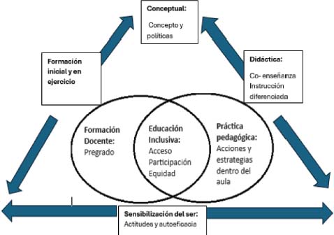 Con base a los hallazgos encontrados se puede concluir que las prácticas pedagógicas de los maestros a favor de la educación inclusiva pueden ser impactadas gracias a la formación docente (figura 2). Esto se logra gracias a las interacciones de elementos como la didáctica, el concepto y políticas de la educación inclusiva y la sensibilización del ser; factores claves para que los docentes puedan desarrollar e implementar estrategias inclusivas efectivas en el ámbito educativo.