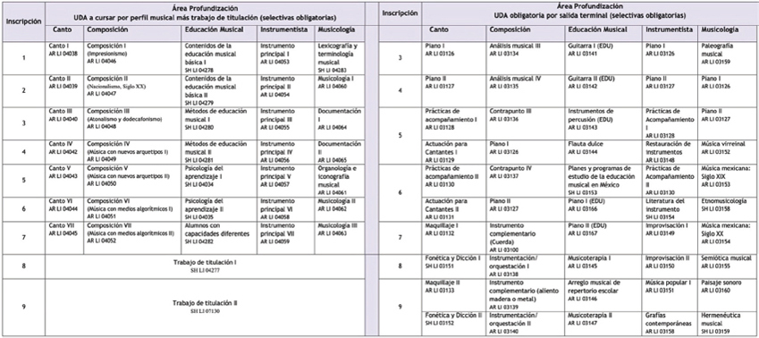 De tal forma, puede constatarse que, de nueve UDA por inscripción, cada estudiante tendría las siguientes UDA activas, con su instrumento: en la primera inscripción, Instrumento principal I y Conjuntos vocales e instrumentales I (dos UDA); en la segunda, Instrumento principal II y Conjuntos vocales e instrumentales II (dos UDA); en la tercera, Instrumento principal III y Conjuntos vocales e instrumentales III (dos UDA); en la cuarta, Instrumento principal IV y Conjuntos vocales e instrumentales IV (dos UDA); en la quinta, Instrumento principal V, Conjuntos vocales e instrumentales V y Prácticas de acompañamiento I (tres UDA); en la sexta, Instrumento principal VI, Conjuntos vocales e instrumentales VI y Prácticas de acompañamiento II (tres UDA); en la séptima, Instrumento principal VII, Conjuntos vocales e instrumentales VII e Improvisación I (tres UDA); en la octava, solamente Improvisación II y, si cada estudiante así lo decide, Trabajo de titulación I (una o dos UDA), y en la novena, solamente Música popular I y, de nuevo, si lo decide, Trabajo de titulación II (una o dos UDA).