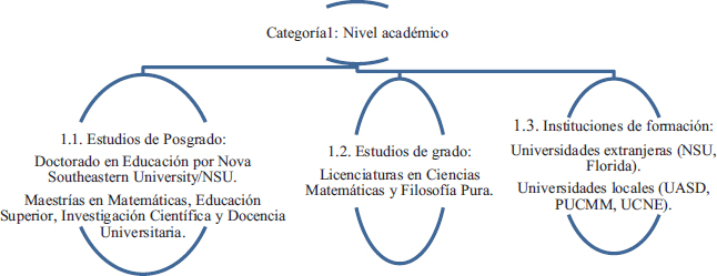 Dos de los docentes (M.S y M.J) tienen el grado de Dr., en Educación por la Nova Southeastern University/NSU Florida-Private University. Los demás docentes (P.N; F.E; J. J; J.A. G.H y M.D.T) cuentan con licenciaturas en Ciencias Matemáticas, Filosofía Pura, y con maestrías en Matemáticas, Educación Superior, Investigación Científica y en Docencia Universitaria, nivel alcanzado por universidades locales como: Autónoma de Santo Domingo (UASD), Pontificia Católica Madre y Maestra (PUCMM), y la Católica Nordestana (UCNE). |