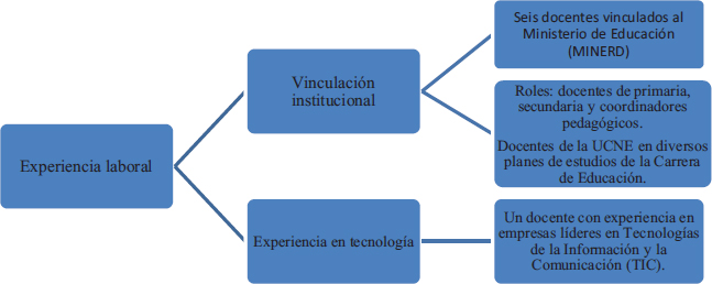 Seis de los docentes (M.S; P.N; F.E; J. J; J.A. G.H y M.D.T) están vinculados al Ministerio de Educación de República Dominicana, en donde se desempeñan como docentes de primaria, de secundaria, coordinadores pedagógicos. Todos trabajan para la UCNE para los diferentes planes de estudios de la Carrera de Educación en sus diversas Menciones. Un docente tiene formación tecnológica, con experiencia en empresas lideres en Tecnología de la Información y la Comunicación. |