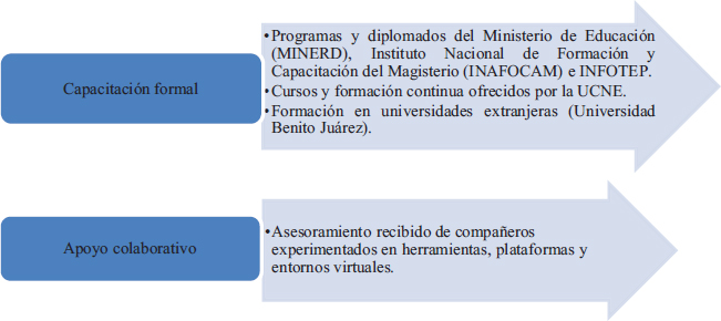 La capacitación la han recibido del Ministerio de Educación de República Dominicana (MINERD) con el Programa de República Digital; por el Instituto Nacional de Formación y Capacitación del Magisterio (INAFOCAM) con diplomados sobre herramientas tecnológicas; con el Instituto Nacional de Formación Técnico Profesional (INFOTEP) con cursos; por la Universidad Católica Nordestana (UCNE) con curso y formación continua. Y por universidades extranjeras como la de Benito Juárez. Además, han recibido apoyo de los compañeros de trabajo con mayor experiencia en el manejo de los entornos, herramientas y plataformas virtuales. |