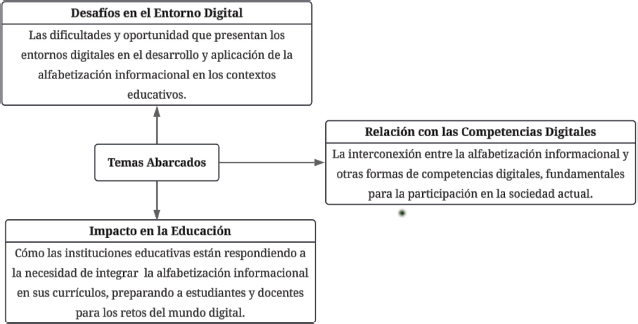 La revisión de literatura se centró en la alfabetización informacional desde tres enfoques diferentes, los cuales son desafíos en la era digital, relación con las competencias digitales y el impacto en la educación, cada uno de estos enfoques se explican en la Figura 1.