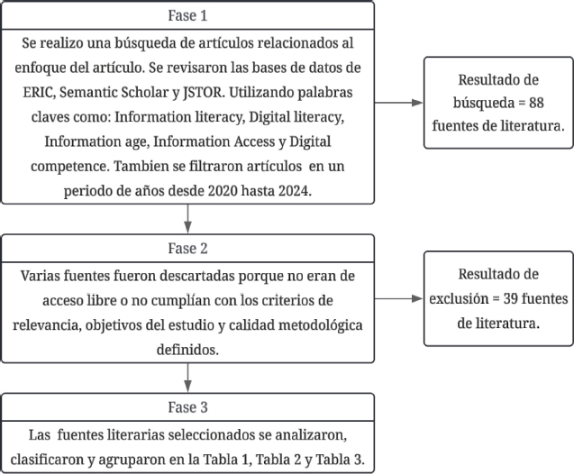 El objetivo principal de este artículo es revisar como la alfabetización informacional ha evolucionado en la era digital actual, también como este tema ha estado tomando relevancia hasta el punto de situarse como una competencia necesaria para la navegación por internet y la correcta gestión de información en un entorno cada vez más saturado de contenido digital falso. Para la realización de este trabajo se realizó una revisión de literatura que abordo como la alfabetización informacional sea venido desempeñando en diferentes contextos académicos, también se establecieron criterios para el filtrado y selección de fuentes literarias basado en un esquema de 3 fase presentado en la Figura 2.