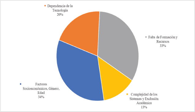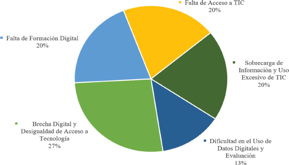 La gráfica presentada en la Figura 3 muestra los principales obstáculos identificados en la literatura revisada. El mayor desafío, con un 27%, es la brecha digital y la desigualdad de acceso a la tecnología, lo que subraya la persistente necesidad de mejorar el acceso equitativo a las herramientas tecnológicas. Otros desafíos relevantes, cada uno con un 20%, incluyen la falta de formación digital, la sobrecarga de información y el uso excesivo de TIC, y la falta de acceso a TIC.