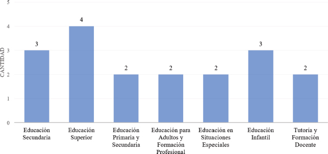 La gráfica de la Figura 5 muestra la distribución de las estrategias pedagógicas aplicadas en diferentes contextos educativos. Como se puede visualizar en la gráfica la mayor concentración de estrategias se ha implementado en la educación superior, seguida por la educación secundaria y la educación infantil. Esto refleja un énfasis en la adaptación de metodologías y herramientas digitales en estos niveles educativos. Por otro lado, los demás niveles tienen una menor concentración esto sugiere que en estas áreas podría haber un mayor margen para la implementación de nuevas metodologías. La educación en situaciones especiales, que incluye educación en crisis o para poblaciones vulnerables tiene solo dos estrategias documentadas lo que podría reflejar la necesidad de continuar desarrollando enfoques pedagógicos adaptados a estos contextos.