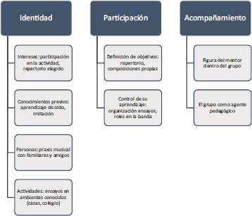 2. Participación: el repertorio es el elemento que conecta la identidad con definición de los objetivos y el control del aprendizaje (organización de ensayos o roles en la banda).
