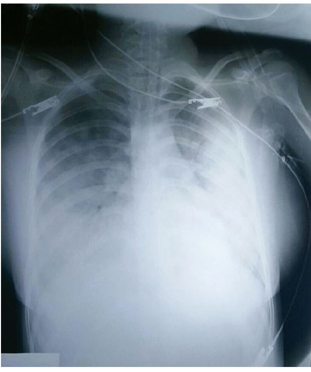 La paciente fue admitida en la unidad de cuidados intensivos pediátricos donde se le realiza una radiografía de tórax con hallazgos compatibles de edema pulmonar (ver figura 1). Su presión arterial gradualmente fue mejorando, por tanto, se remueve la ventilación asistida y las aminas vaso activas, al segundo día. Al tercer día, se suspende el inotrópico y es trasladada a una sala clínica. Al sexto día de manejo, se realiza una radiografía control (ver figura 2), donde se observa una importante mejoría. En consecuencia, es egresada.
