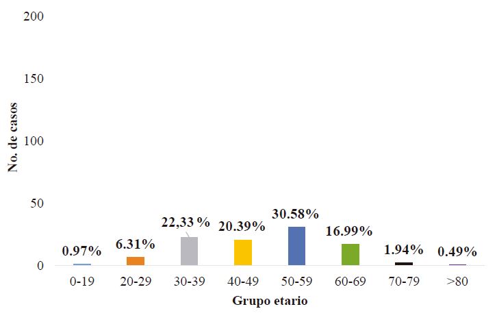 Gráfica 2: Distribución de nódulos tiroideos según el grupo etario (N=206)