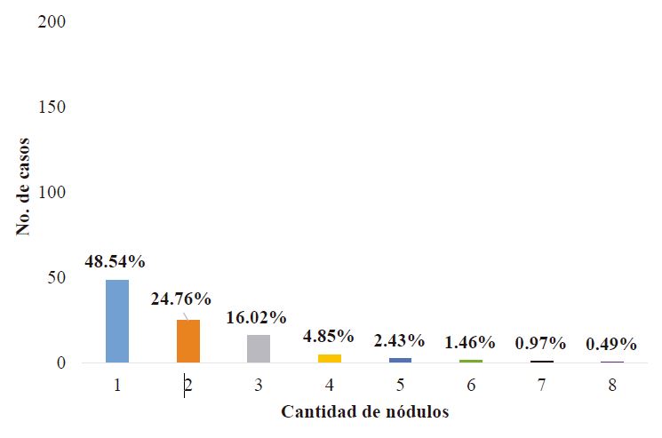 La cantidad de nódulos tiroideos que presentan los pacientes de esta investigación, de una población de 206 individuos, muestra que, al momento del diagnóstico, la cantidad que presentó mayor repetición fue de un solo nódulo (51.46%). Así, se determina que la aparición de múltiples nódulos al momento del diagnóstico es menos frecuente. El estudio titulado Comportamiento de la enfermedad nodular del tiroides en el Servicio de Cirugía General del Hospital Vladimir Iich Lenin de Holguín, realizado en Cuba por el doctor Joaquín Alejandro Solarana Ortíz13, expone que la cantidad de nódulos tiroideos más frecuente fue de un solo nódulo, por tanto, coincide con los resultados de esta investigación.