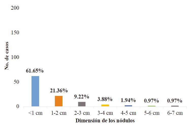De acuerdo a los resultados mostrados en la siguiente gráfica, las dimensiones espaciales más comunes son las menores de 1 cm, siendo 0.4 cm la más común. La probabilidad de que un nódulo tenga las dimensiones espaciales entre 1-7 cm disminuye gradualmente. El rango entre 1-2 cm es el que presenta la segunda posición de acuerdo a su frecuencia, con un 21.36%, equivalente a 44 casos. Cabe destacar que es atípico observar un nódulo con un tamaño mayor de 4 cm: un 1.94%, equivalente a 4 casos, con una dimensión espacial de 4-5 cm; un 0.97%, equivalente a 2 casos, con una dimensión espacial de 5-6 cm. La dimensión espacial entre 5-6 cm y 6-7 cm presentan la misma frecuencia, como resultado, tienen el mismo porcentaje.