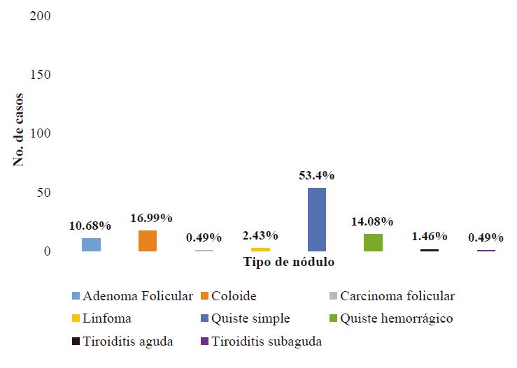 Según la histología de los nódulos diagnosticados, los quistes simples ocupan una mayor frecuencia con relación a los demás tipos de nódulos, presentando el 53.4%, equivalente a 110 casos. Los coloides presentan una frecuencia de 16.99%, equivalente a 35 casos, mientras que los quistes hemorrágicos ocupan un 14.08%, equivalente a 29 casos. Los adenomas foliculares se encuentran en 22 casos, con un 10.68%. Los linfomas tienen el tercer menor porcentaje, un 2.43%, con solo 5 casos observados. Luego le sigue la tiroiditis aguda, presente en tres casos, con un 1.46%. Del mismo grupo, la tiroiditis subaguda posee un 0.49%, como el carcinoma folicular, cada uno con un solo caso (ver gráfica 5).