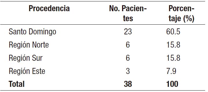 De las 38 pacientes con Síndrome de Turner que pertenecen al Programa de Alto Costo, 23 proceden de Santo Domingo, representando un 60.5% del total; esto probablemente se deba al hecho de que en la metrópolis se concentra la mayor cantidad de especialistas pediatras que captan con más frecuencia la llegada de la paciente por estatura baja, así como también de subespecialistas que dan curso a pacientes con esta característica. La Región Este, de acuerdo con los datos de procedencia, fue la menos afectada por este síndrome dentro de la población estudiada.