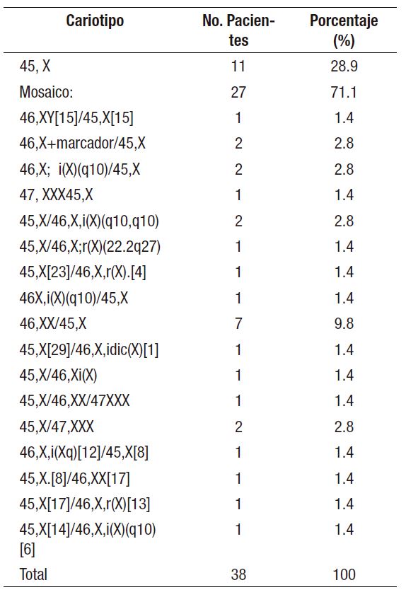 El cariotipo de mayor representación fue el Mosaicismo, con el 71.1% del total (23 pacientes), mientras que el cariotipo 45 X, obtuvo un 28.9% (11 pacientes). Barreda et al.15 reportan un 50% de estos pacientes con cariotipo de Turner puro XO o con cariotipo 45 X.