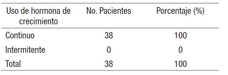 El 71.1% de las pacientes (27 casos) presentó cariotipo de mosaico, y solo en el 28.1 % de ellas (11 casos) el reporte fue 45X (ver cuadro 3). Por otra parte, en el cuadro 4 puede apreciarse la frecuencia de uso de la hormona de crecimiento en las pacientes estudiadas.