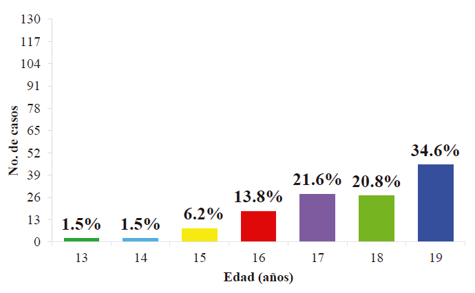 De acuerdo a los resultados obtenidos, se observa que la mayoría de las adolescentes embarazadas tenía 19 años de edad, con un 34.6%, correspondiente a 45 sujetos de la muestra. A continuación, le siguen las adolescentes que tenían 17 años de edad, con un 21.6%, que representa 28 pacientes; un 20.8% de las adolescentes tenía 18 años, equivalente a 27 adolescentes; un 13.8%, perteneciente a adolescentes con 16 años, con un total de 18 sujetos; un 6.2%, que corresponde a adolescentes con 15 años, representando a 8 pacientes; y un 1.5% para las adolescentes con 14 años, con un total de 2 adolescentes, igualando el 1.5% de las adolescentes con 13 años embarazadas.