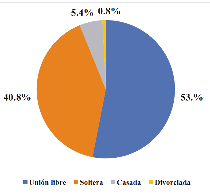 Del 100% de la muestra estudiada, los resultados mostraron que más de la mitad de las adolescentes embarazadas se encontraba en un estado de unión libre (53%), correspondiente a 69 casos. Más del 40% de ellas (53 casos) se encontraban solteras; 7 adolescentes estaban casadas, para un 5.4%, y el 0.8% restante correspondió a una adolescente