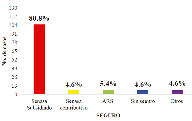 Según otro estudio, que lleva por título Madres adolescentes en República Dominicana, de la Oficina Nacional de Estadística (ONE), las condiciones socioeconómicas influyen en la fecundidad adolescente. El tipo de seguro más utilizado fue el Senasa subsidiado, con más de un 80%, lo que significa que la gran mayoría de las pacientes asistidas en este hospital era de bajos recursos, porque este es un servicio cubierto totalmente por el Estado. Mientras que el 19.2% de las pacientes pertenecía a una posición socioeconómica más elevada, debido a que utilizan seguro de salud privado, lo que confirma lo dicho en el estudio previamente mencionado, que el nivel socioeconómico de las pacientes interviene en gran medida en la tasa de embarazos16.