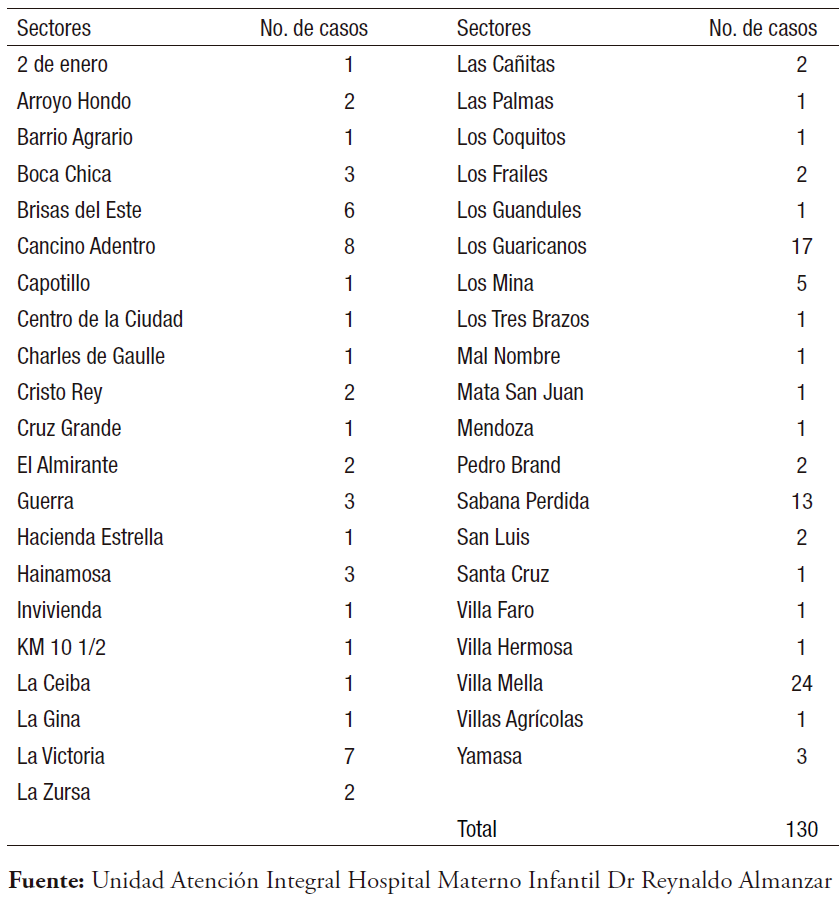 Villa Mella fue el sector donde se hallaron más adolescentes embarazadas (18.5%), seguido de otros sectores como Los Guaricanos (13.08%) y Sabana Perdida (10%). Estos sectores tienen un bajo nivel socioeconómico y educativo, lo que permite inferir que la cantidad de adolescentes embarazadas está estrechamente relacionada con su localización geográfica, relacionándolo, a su vez, con el nivel económico y educativo propios de estos sectores. La investigación Diagnóstico de la situación del embarazo en la adolescencia en Chile, 2008, del Ministerio de Salud, Gobierno de Chile, UNFPA y FLASCO-Chile15, reveló que el 65% de los nacimientos de hijos/as de madres adolescentes ocurre en zonas rurales, donde hay menos recursos económicos; mientras que un 35% pertenece a las zonas urbanas, donde existe mayor nivel económico. Este estudio llegó a la conclusión de que existe un vínculo entre la tasa del embarazo adolescente y el sector donde estas residen, corroborando los datos reflejados en la presente investigación.