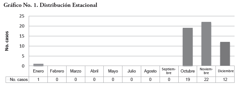 Cada año el VSR suele producir brotes estacionales, comenzando a fines del otoño y persistiendo durante el invierno y se considera responsable de las epidemias de IRAB en esta estación. Sin embargo, pueden ocurrir casos esporádicos durante todo el año. En nuestro estudio se encontró que el 98.2% de los casos ocurrieron en los meses octubre a diciembre, como sucede a nivel mundial (ver gráfico No. 1).18