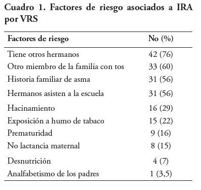 Como factores de riesgo, la prematuridad, la exposición al humo de tabaco, la ausencia de lactancia materna, el hacinamiento, entre otros, son considerados importantes en la severidad del cuadro y la presencia del VSR; sin embargo, en nuestro estudio otros factores fueron los asociados (ver cuadro No. 1).