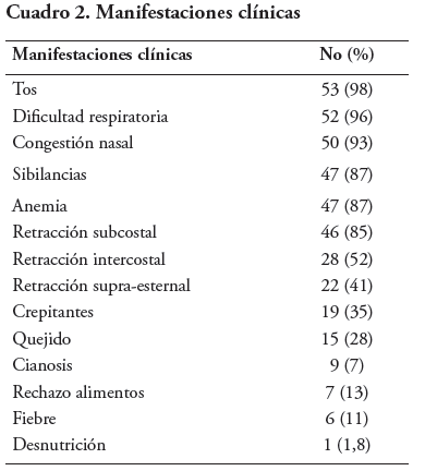 Tos y dificultad respiratoria se presentaron en el 99% de los casos, sibilancias en el 92% y dificultad respiratoria en el 88%. El 80% presentó anemia, hallazgo no reportado en otros estudios (ver cuadro 2).