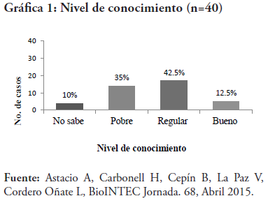 Los resultados revelan que la mayoría de los padres (17 casos) tiene un conocimiento regular, representado por un 42.5%; seguido de un 12.5% (5 casos) que tenía un conocimiento bueno. Solo un 35% de la muestra (14 casos) obtuvo un conocimiento pobre. No obstante, podemos notar que únicamente el 10% (4 casos) de todos los padres entrevistados no sabe sobre el proceso patológico de la FQ.