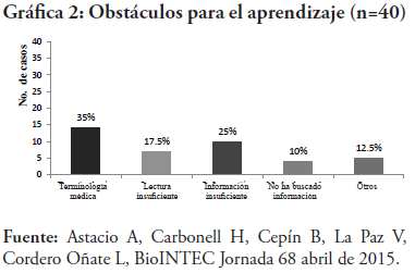 Del total de padres encuestados, el 35% (14 casos) mencionó que la razón que no le permite comprender es la terminología médica; el 25% (10 casos) dice que recibe muy poca información por parte de los prestadores de salud; un 17.50% (7 casos) indicó que el motivo era que no tenían material de lectura suficiente a su alcance. En menor proporción se encuentran las razones de que no han buscado la información, otros no saben qué es exactamente lo que deben buscar, con valores de 7.5% (3 casos) y 2.5% (1 caso), respectivamente. Por último, un total de 12.5% (5 casos) afirmó que ninguna de estas eran las razones del déficit de conocimiento que poseían.