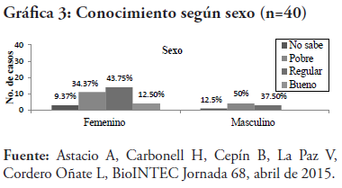 Se pudo apreciar que, deun total de 40 padres, el sexo femenino fue representado por 32 mujeres. De estas,solo 14 obtuvieron en mayor magnitud un nivel de conocimiento regular, representado por un 43.75%, seguido por 11 madres que alcanzaron un nivel de conocimiento pobre, significando esto el 34.37% del total. En menor frecuencia estuvieron las que presentaron un conocimiento bueno y deficiente, con 4 y 3 casos, para un 12.50% y 9.37%, respectivamente. Por otro lado, el total de hombres encuestados fue de 8 padres, dando como resultado que la mayoría de estos poseía un nivel de conocimiento pobre, significando el 50% de ellos (4 casos), mientras que solo el 37.50% tenía un nivel de conocimiento regular.