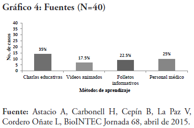Para finalizar, un 35% de los padres de los pacientes entrevistados decidió que el mejor método para su aprendizaje era a través de charlas educativas, lo que concuerda con un estudio realizado en la Universidad de Ciencias Médicas en Tehran, por los investigadores Roya Sadeghi, Mohammad Medhi y Faramarz Sha Ahmadi, durante los años 2012-2013, nombrado Comparison of the effect of lectura and blended teaching methods on student’s learning and satisfaction, mostrando que un 88.9% de los estudiantes mejoró su nivel de conocimiento acerca de los síntomas más comunes de tuberculosis al impartirles charlas educativas7 ( ver gráfica 4).
