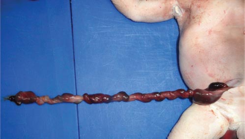 Figura 1. Foto que muestra cordón umbilical unido al feto, nótese múltiples vueltas del cordón