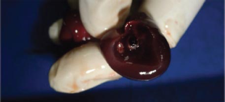 Figura 2. Foto que muestra cordón umbilical al corte, nótese coágulos en la vena umbilical