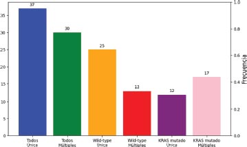 El 55.2 por ciento de los pacientes presentaron enfermedad metastásica única, frente al 44.8 por ciento que tenían metástasis múltiples. Las metástasis múltiples fueron más frecuentes en los tumores KRAS mutados en el 58.6 por ciento de los casos, siendo el lugar más frecuente el hígado en el 66 por ciento, seguido del pulmón en el 39 por ciento. Esto contrasta con lo presentado por Ucar G, Ergun Y, Aktürk-Esen S, Acikgoz Y, Dirikoc M, Esen Y, et al, en su estudio en el 2020 sobre el valor pronóstico y predictivo del número de mutaciones de KRAS en el cáncer colorrectal metastásico, donde las metástasis múltiples se evidenciaron en sólo el 33 por ciento de los pacientes mutados, más concuerda en que los lugares de metástasis más frecuentes son el hígado (68 %) y pulmón (26 %).13,12