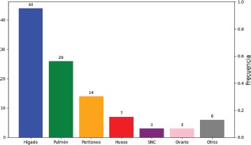 El lugar más frecuente de metástasis fue el hígado en el 66 por ciento de los casos, seguido del pulmón en el 39 por ciento. Los menos frecuentes fueron ovario y SNC que se presentaron en un 4 por ciento de los casos cada uno.