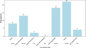 La localización más frecuente del tumor primario correspondió al recto en un 32.8 por ciento, seguido del colon sigmoides en un 26.9 por ciento. La localización menos frecuente fue el colon descendente donde no se registró tumor.