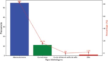 El tipo histológico adenocarcinoma fue el más predominante en el 82 por ciento de los casos, seguido del adenocarcinoma mucinoso en el 16.5 por ciento.