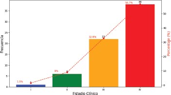 El estadio clínico inicial más frecuente fue el estadio IV en un 56.7 por ciento y el menos frecuente fue el estadio I en el 1.5 por ciento.