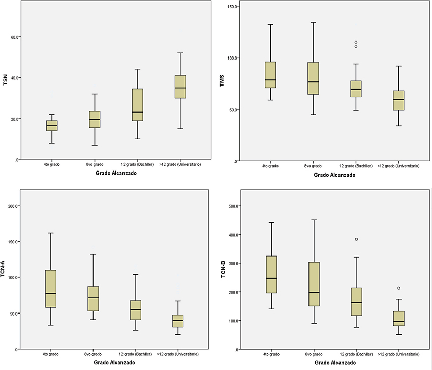 Resultado: La escolaridad y la edad fueron variables determinantes en el desempeño de las 5 pruebas psicométricas. Pero, la correlación univariable de la edad con el desempeño de la prueba TMS no hubo diferencias intra e inter grupos estadísticamente significativas (p>0.171).