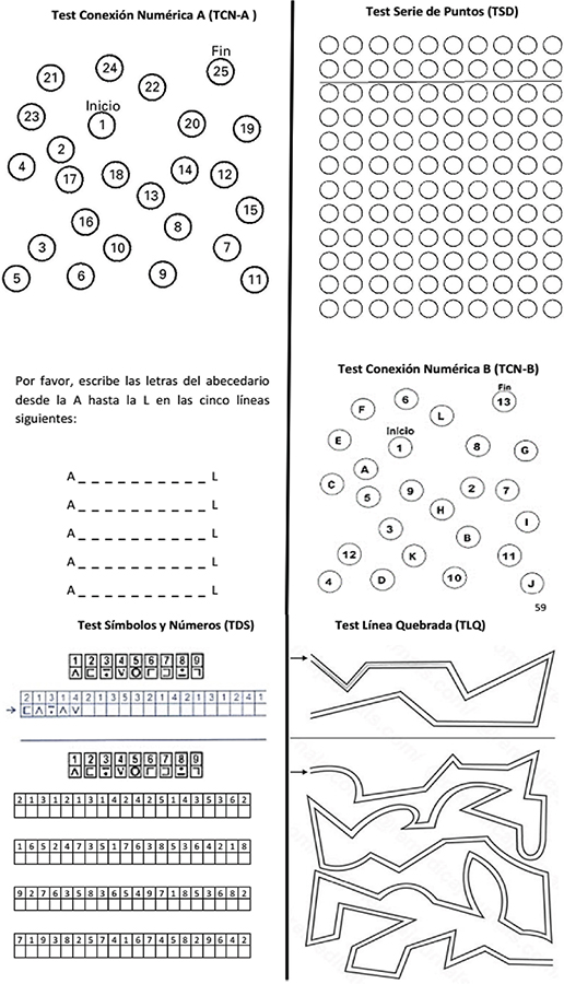 TSN: test de símbolos y números. TLQ: test de línea quebrada. TCN-A: test de conexión numérica A. TMS: test de marcado seriado. TCN-B: test de conexión numérica B.