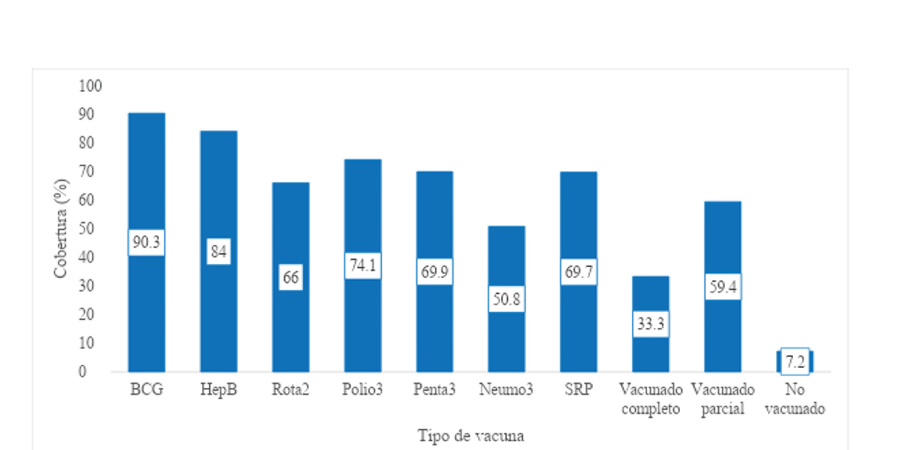 BCG: Bacilo de Calmette Gleum; HepB: Hepatitis B al nacimiento; Polio3: tercera dosis de poliomielitis; Penta3: tercera dosis de pentavalente; Neumo3: tercera dosis de neumococo; Rota2: segunda dosis rotavirus; SRP: primera dosis de la vacuna contra sarampión, papera y rubeola.