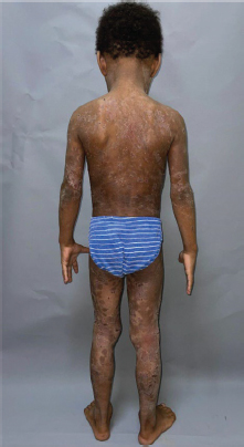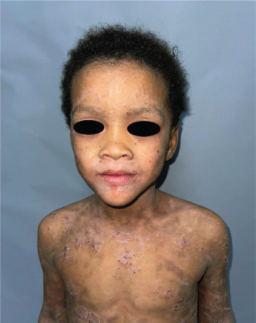 Paciente masculino de 4 años de edad, fototipo IV de Fitzpatrick, procedente y residente de San Cristóbal, República Dominicana, es traído a consulta por su madre por dermatosis que afecta cara, tronco y extremidades desde el nacimiento, pruriginosa. Al examen físico, presenta dermatosis en cara constituida por placas eritematosas y descamativas (Figura 1). En el tronco y las extremidades se observan múltiples placas eritemato-descamativas, con doble borde descamativo, policíclicas, de límites mal definidos e irregulares y tamaños variables. Algunas excoriadas, de superficie costrosa, cubiertas de costras de aspecto serohemático e intensamente pruriginosas (Figura 2, 3 y 4 ).