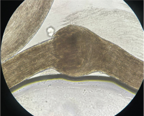 El cabello era frágil, seco y quebradizo. En una muestra de pelo de cuero cabelludo evaluada mediante microscopía óptica, se observaron fracturas transversales del tallo piloso, en las que la parte distal del pelo se invaginaba en la parte proximal, demostrando la presencia de tricorrexis invaginata, también denominada tallos o pelos en “caña de bambú” (Figura 5). El resto del examen físico resultó normal.
