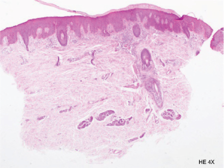 Se tomó una biopsia de espalda superior, la cual histopatológicamente reportó dermatitis psoriasiforme y espongiótica (Figuras 6 y 7). A la correlación clínico-patológica los hallazgos fueron vinculables con ictiosis lineal circunfleja.