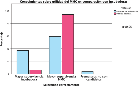 Existe una diferencia significativa (p=0.040) entre la profesión y las percepciones sobre la supervivencia de los neonatos en el MMC en comparación con incubadoras (gráfica 2).