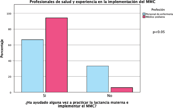 Los hallazgos presentados en la gráfica 4 indican una asociación significativa entre la profesión del personal de salud (personal de enfermería vs. médico pediatra) y la práctica e implementación del MMC, destacando que las pediatras participan más activamente que las enfermeras en la implementación del MMC. Dicha observación se correlaciona con estudios previos que evaluaron el conocimiento y las percepciones del MMC entre proveedores de salud, encontrando que, aunque ambos grupos conocían los beneficios del MMC, las enfermeras carecían de una capacitación formal adecuada en comparación con los pediatras, lo que resultaba en una comprensión insuficiente de la técnica y su importancia10. Además, investigaciones han revelado que las enfermeras, en comparación con los pediatras, tienen un nivel bajo de conocimiento y habilidades en la implementación del MMC, y se sienten inseguras en su capacidad para facilitar la técnica14.